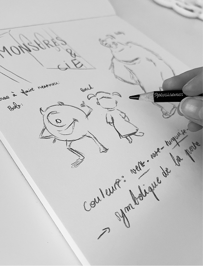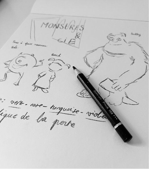 Comme pour chaque projet, je griffonne, j’essaie : armée de mon polychromos noir, j’esquisse les personnages, les imagine sous une autre forme. je pose un nouveau regard sur le film !